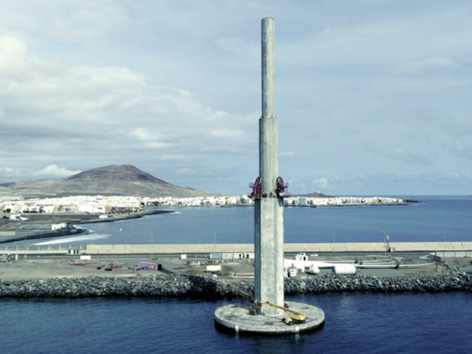 Ob Image-fördernde Absicht oder nicht: Das Internetportal des Konsortiums Elican (Elisa) zeigt die selbstinstallierende Fünf-Megawatt-Turbine im Mittelmeer in einer grafischen Darstellung zunächst in der Anmutung einer griechischen Tempelsäule. Doch was dort vor dem gezeichneten Panorama einer typischen gebirgigen Mittelmeerküste so verspielt antikisierend aus dem virtuellen Meer ragt ist eine technologische Revolution. Die vom Forschungsprogramm Horizon 2020 der Europäischen Union (EU) geförderte Windturbinen-Unterwasserfundament-Kombination bekommt Mittel aus einem Budget von 17 Millionen Euro. Denn sie soll nicht weniger, als die gewohnte Gründung von Offshore-Windenergieanlagen auf in den Boden gerammten Mono-Stahlzylindern, Monopiles, möglicherweise über den Haufen werfen. Äußerlich ist davon nur einer von mehreren Aspekten zu erkennen: So steht der jetzt im Hafen Arinaga der spanischen Atlantik-Insel Gran Canaria vertäute Prototyp auf einem eckigen Betonturm statt wie in der herkömmlichen Windkraft gewohnt auf einem runden Stahlzylinder.