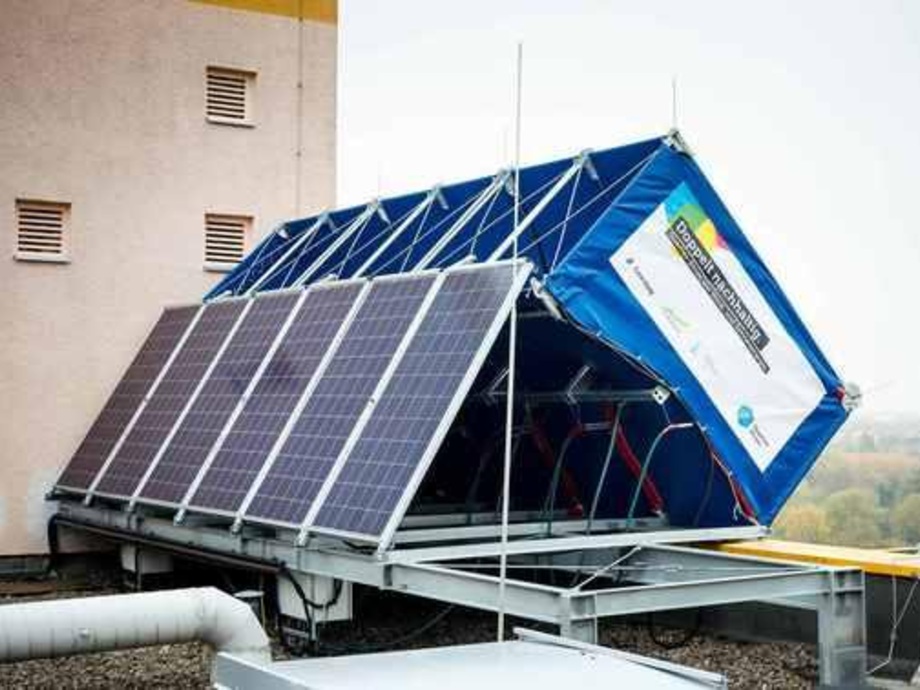 Die Anlagen werden auf Dächern installiert und bestehen pro Modul aus vier Solarpaneelen und einem Windkanal mit jeweils zwei Windturbinen. Dieser Windkanal verstärkt den natürlichen Wind, der die Dachkante überströmt und nutzt die Druckunterschiede am Gebäude: Die Luft strömt durch einen zweieinhalb Meter langen sogenannten Venturi-Kanal. Durch den Druckunterschied vor und hinter dem Kanal wird die natürliche Windgeschwindigkeit erhöht. Dadurch stehe mehr Windleistung bei gleicher Fläche zur Verfügung, verspricht der Schweizer Entwickler. Die Windströmungen kühlten zugleich die Solarpaneele und erhöhten so deren Wirkungsgrad.