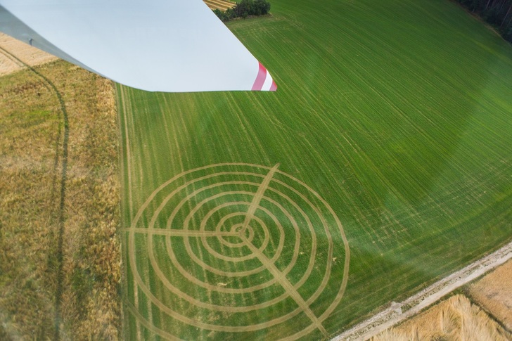 Perfekt, das bedeutet, dass sich von der Aussichtsplattform der Windenergieanlage aus ein besonderer Blick bietet: Im Klee- und im Kornfeld winden sich Spiralen, durchbrochen von den Flügeln einer Windturbine.