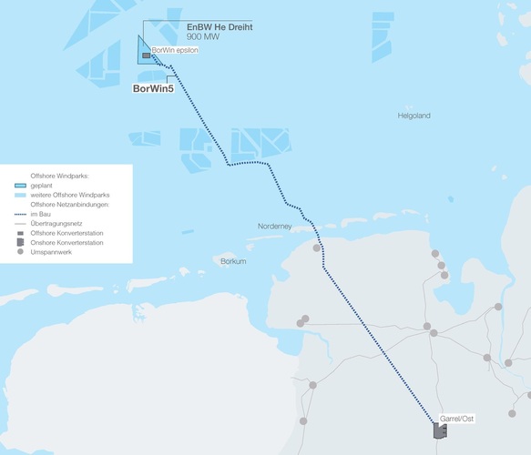 Außerdem ist Borwin 5 nach Dolwin 5 das zweite Projekt, bei dem die Windenergieanlagen direkt über 66-Kilovolt-Drehstromkabel mit der Offshore-Plattform Borwin Epsilon verbunden werden. Dadurch fallen die bislang in jedem Windpark notwendigen Umspannstationen weg. Zudem sind keine 155-kV-Drehstromkabel zur Verbindung der Offshore-Plattform von Tennet mit der des Windparks mehr notwendig. Mittels eines 230 Kilometer langen Höchstspannungsgleichstromkabels überträgt Tennet den Strom nach der Umwandlung mit verlustarmer Gleichstromtechnologie an die Konverterstation Garrel/Ost an Land. Hier wird der Gleichstrom wieder in Drehstrom umgewandelt und ins Höchstspannungsnetz eingespeist. Mit der 66-kV-Direktanbindung gehört Borwin 5 zu der neuen Generation kosteneffizienter Offshore-Netzanbindungen, die einen wichtigen Beitrag zur Energiewende leisten.