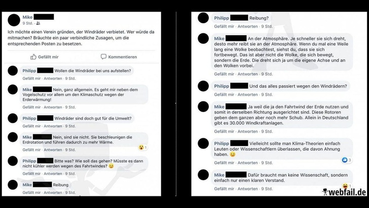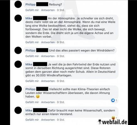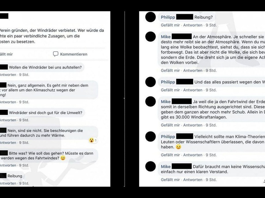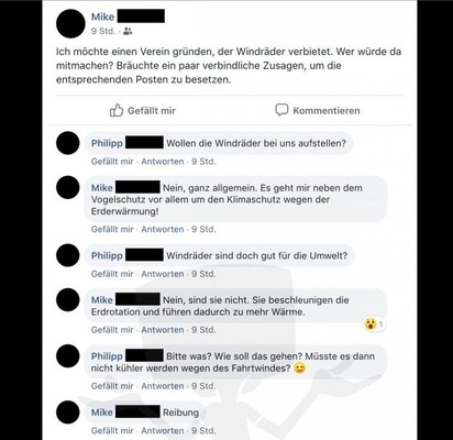 „Ich möchte einen Verein gründen, der Windräder verbietet“, schreibt Teilnehmer Mike in einer eigenartigen Logik. Darauf fragt ihn Facebook-Besucher Philipp scheinbar arglos: „Wollen die Windräder bei uns aufstellen?“ Woraufhin Mike ein Rätsel aufgebend antwortet: „Nein, ganz allgemein. Es geht mir neben dem Vogelschutz vor allem um den Klimaschutz wegen der Erderwärmung!“ – als seien Windräder irgendwie für die Erderwärmung zuständig. Diesem vermeintlichen Missverständnis geht Philipp nach und fragt zurück: „Windräder sind doch gut für die Umwelt!“ Woraufhin Mike auf eine explodierend farbenfrohe Gedankenwelt durchblicken lässt: „Nein, sind sie nicht. Sie beschleunigen die Erdrotation und führen dadurch zu mehr Wärme.“