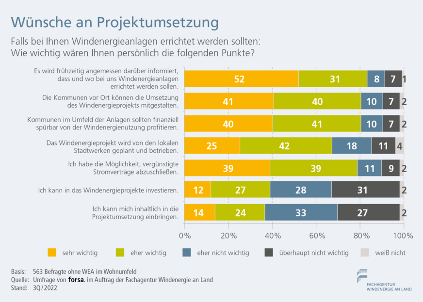 Eine Diskrepanz zwischen Wunsch und Wirklichkeit zeigt sich bei der Umsetzung von Projekten: Beim Bau eines Windparkst im eigenen Wohnumfeld wären jeweils über 80 Prozent der Befragten eine frühzeitige angemessene Information, Mitgestaltungsmöglichkeiten sowie die finanzielle Beteiligung der Kommunen wichtig. Bei 79 Prozent gilt dies auch für vergünstige Stromtarife. Bei realisierten Windenergieprojekten gibt jedoch nur ein kleinerer Teil der Befragten (27-44 %) an, dass diese Aspekte auch wirklich erfüllt waren. (kw)