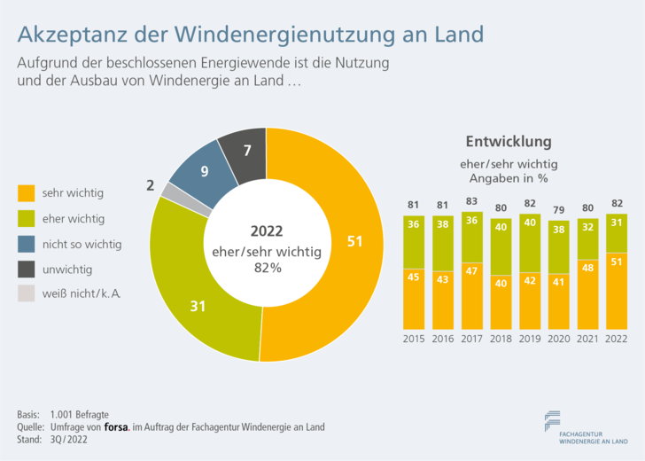 Der Ukraine-Krieg sorgt für mehr Akzeptanz der Windenergie: Wie die jüngste Forsa-Umfrage im Auftrag der Fachagentur Wind an Land ergab, ist 82 Prozent der Befragten und der Ausbau der Windenergienutzung an Land als „wichtig“ oder „sehr wichtig“. Mehr als die Hälfte (51 Prozent) und damit so viele wie noch nie sagten, ihnen sei der Ausbau sehr wichtig. Ein Drittel gab an, dass der russische Angriff auf die Ukraine die Relevanz des Ausbaus der Windenergie noch weiter verstärkt habe.