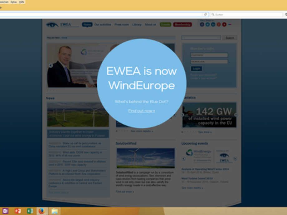 Der Internetauftritt von Wind Europe verpasst dem Europäischen Windenergieverband unter dieser sicherlich noch nicht endgültigen Adresse auch ein neues Outfit: https://windeurope.org/. Weiterhin ist der Verband allerdings auch unter seiner angestammten bisherigen Onlnie-Adresse zu erreichen, sofern der Hinweisbutton für den neuen Auftritt als Wind Europe ignoriert der Online-Besucher einmal ins große Feld außerhalb des Wind-Europe-Kreises klickt.