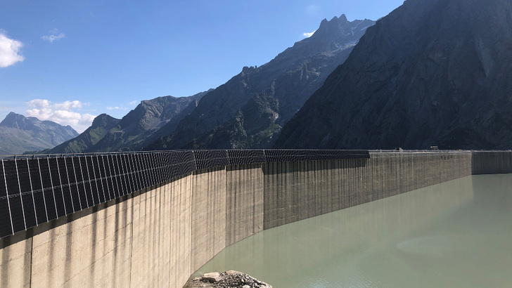 Denn einerseits ist die Sonneneinstrahlung in einer luftigen Höhe von etwa 2.100 Metern über dem Meeresspiegel ohnehin sehr hoch. Dazu kommen noch die niedrigen Temperaturen, die in der Regel über dem Wasserspiegel herrschen. Dadurch werden die kristallinen Siliziummodule gut gekühlt, was die Effizienz in die Höhe treibt. Dazu kommt noch der Anstellwinkel. Da die Module fast parallel zur Staumauer mit einem extrem hohen Anstellwinkel angebracht werden, bleibt auf ihnen im Winter kein Schnee liegen. Dazu kommt noch, dass sie auf diese Weise die tiefer stehende Wintersonne besser nutzen können als flacher aufgeständerte Module. Zusammen mit dem Albedoeffekt – der Nutzung des vom Schnee reflektierten Lichts – rechnen die Planer damit, dass etwa die Hälfte des üppigen Ertrags von 500 Megawattstunde pro Jahr auf die Wintermonate entfällt.