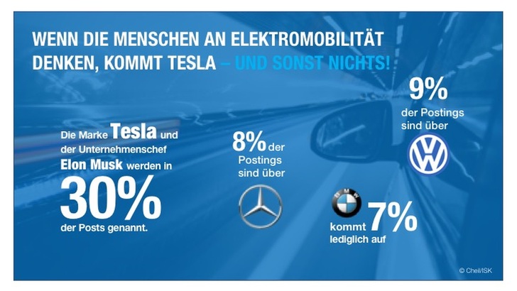 Das Ergebnis einer vom Institut für Strategie und Kommunikation (ISK) und Cheil Germany durchgeführten Studie zur Elektromobilität ist eindeutig: Tesla und Elon Musk dominieren das Web in Sachen Elektromobilität. Für die Studie von ISK und Cheil wurden über 1,3 Mio. Posts und Kommentare im Zeitraum März 2018 bis April 2019 im deutschsprachigen Web untersucht. Der Abstand der deutschen Autobauer gegenüber Tesla ist noch größer als gedacht. Die Autos des kalifornischen Herstellers dominieren nicht nur das Straßenbild, auch im Internet beherrschen Tesla und dessen CEO Elon Musk die Gesprächslandschaft: Wenn sich die Menschen über Elektromobilität austauschen, dann denken sie an und reden über Tesla.
