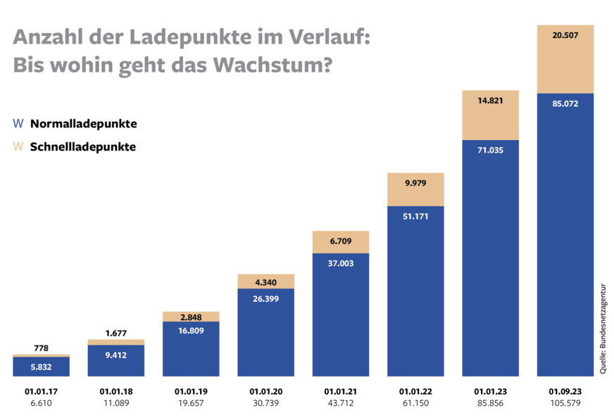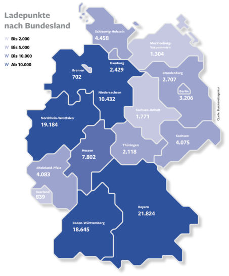 40 Prozent mehr Ladepunkte gibt es in Deutschland allein im Zeitraum vom 1. September 2022 bis zum 1. September 2023. Innerhalb eines Jahres sind damit knapp 30.000 neue Ladesäulen entstanden. Im Vergleich der Bundesländer gibt es besonders viele Einheiten in Bayern, Baden-Württemberg und Nordrhein-Westfalen. Dieses Ergebnis lässt sich vermutlich auf die Fläche der Landesteile zurückführen. Jedoch sind die Ausprägungen in den flächenmäßig kleinen Bundesländern Berlin und Hamburg größer als in Mecklenburg-Vorpommern oder Sachsen-Anhalt. Daraus ergibt sich, dass besonders in urbanen Räumen die Ladepunktdichte deutlich höher ist als in ländlichen Gebieten. Das bestätigt auch der Blick auf die Ladesäulen-stärksten Landkreise. Neben der Stadt Hamburg und der Stadt Berlin gehört die Stadt München zu den Landkreisen mit den meisten Ladesäulen. Gleichzeitig steigt der Anteil von Schnellladesäulen kontinuierlich. Dazu zählt die Statistik alle Ladepunkte ab 22 Kilowatt. Gab es 2020 noch einen Anteil von rund 16 Prozent von Schnellladesäulen an der Gesamtzahl, sind es im September 2023 mehr als 24 Prozent. Das größte Wachstum aller Ladesäulenklassen konnte zudem die Gruppe zwischen 149 und 299 Kilowatt verbuchen. Mit großem Abstand ist das meistverbaute Steckersystem der AC-Typ-2 Stecker. Er ist europäischer Standard und schafft eine Leistung bis 43 Kilowatt. Die größte Entwicklung nehmen jedoch auch hier Stecker, die eine größere Leistungsspanne abdecken.