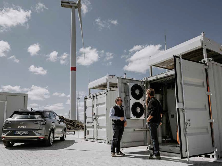 Insgesamt haben sich mit GP Joule 19 regionale Partner zur E-Farm-Trägergesellschaft vereint. Die dazu gehörenden Energieanlagen schließen 3.000 daran beteiligte Bürger und Bürgerinnen mit ein. Sie profitieren doppelt: Neben Erlösen aus der Wasserstoffproduktion sichern sie sich für ihre Windparks ab 2021 einen stabilen Absatz des Stroms. Denn dann endet nach 20 Jahren Betriebszeit die im Erneuerbare-Energien-Gesetz (EEG) verbriefte Vergütung seitens der Netzbetreiber. Durchgängig nimmt jeder Elektrolyseur 225 kW ab. Über diesen Sockel-