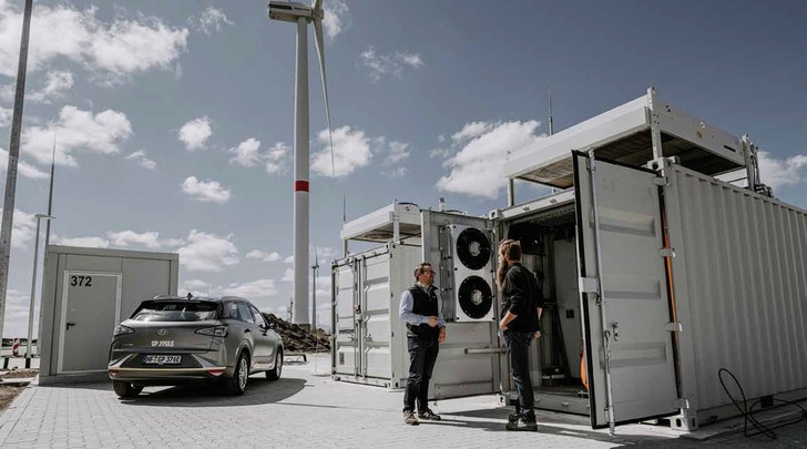 Fünf PEM-Elektrolyseure mit jeweils 225 Kilowatt (kW) produzieren in diesem „eFarm“ genannten System künftig mittels Windstrom klimafreundlichen Wasserstoff. Zwei der Elektro-