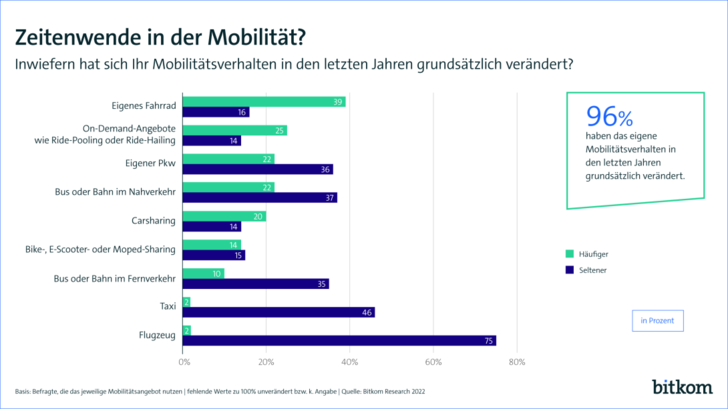 Rund die Hälfte (55 Prozent) nennt die Klimakrise als Grund, 41 Prozent das 9-Euro-Ticket sowie den gestiegenen Benzinpreis und 30 Prozent die Angst vor einer Ansteckung mit dem Corona-Virus. 17 Prozent haben ihr Mobilitätsverhalten aufgrund des Chaos an den Flughäfen verändert, 16 Prozent wegen der häufigeren Arbeit im Home Office, 13 Prozent aufgrund der Unzuverlässigkeit im Bahnverkehr und 7 Prozent wegen des Wegfalls von Dienstreisen.