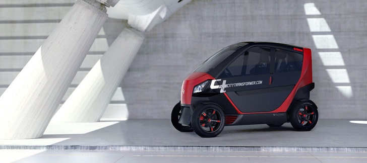 Bei Parkplatzmangel hilft ein neues Elektroauto, das sich zusammenfalten lässt. Der City Transformer kann per Knopfdruck ein- und ausgefahren werden. Ist der Unterbau eingefaltet, kommt das Fahrzeug auf einen Meter breit.