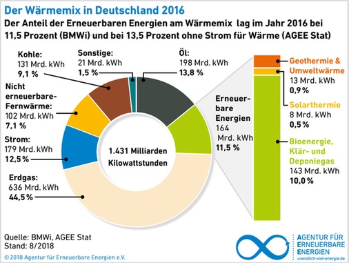 AEE leistet Überzeugungsarbeit für die Energiewende. Ihre Aufgabe ist es, über die Chancen und Vorteile einer Energieversorgung auf Basis erneuerbarer Energien aufzuklären. Zuletzt wies AEE auf einen Mangel an Wärmewende hin. Nur 11,5 Prozent der deutschen Wärme würden aus Erneuerbaren gedeckt, so die Agentur. Dabei haben Wärme und Kälte einen Anteil von knapp 50 Prozent am Endenergieverbrauch. Von den 1.431 Milliarden Kilowattstunden Wärme, die in Deutschland 2016 genutzt wurden, waren lediglich 164 Milliarden Kilowattstunden auf Erneuerbare Energien zurückzuführen. Bioenergie, Klär- und Deponiegas machen hierbei den größten Anteil aus. Die Flexibilität der Bioenergie ist für das Energiesystem der Zukunft unabdingbar. Als Einsatzstoffe bieten sich unter anderem Holz und Energiepflanzen an.