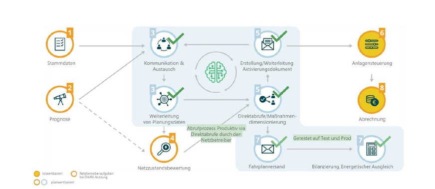 Die Prognosedaten und Fahrpläne werden dabei entweder durch die Anschlussnetzbetreiber selbst oder durch die Einsatzverantwortlichen erstellt und gemeldet. In der aktuellen Praxis sind diese Prozesse aber noch vielfach fehlerhaft oder nur ungenügend umgesetzt, sodass die Bundesnetzagentur (BNetzA) in ihrem Eckpunktepapier eine deutliche Verbesserung durch einen weitergehenden Testbetrieb angemahnt hat. Die eigentlichen DA/RE-Prozesse (blau eingefärbt) stellen sicher, dass alle relevanten Netzbetreiber die benötigten Daten weitergeleitet bekommen. Zur Kommunikation mit den Einsatzverantwortlichen ist die Plattform technisch zudem an Connect+ angebunden.