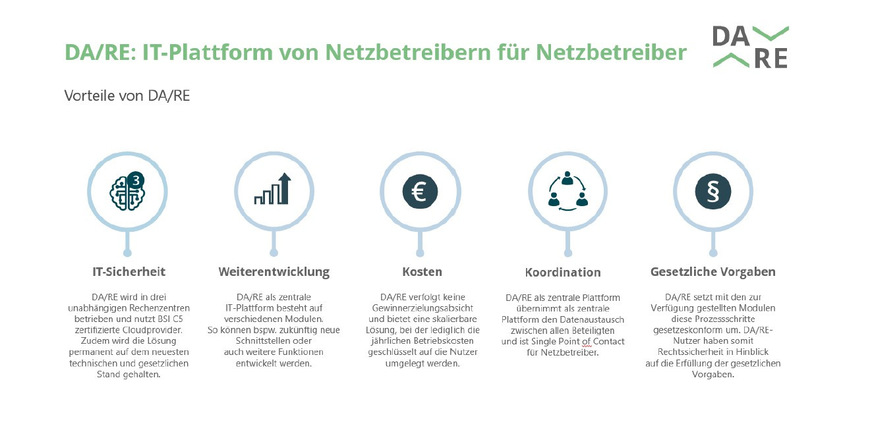 DA/RE ist eine cloudbasierte IT-Plattform mit einem sehr hohen IT-Sicherheitsstandard. Dabei wird beispielsweise auf einen Cloudanbieter mit C5-Zertifizierung gesetzt, dabei stehen neben der Dokumentation insbesondere auch die tatsächlichen Prozesse im Vordergrund. Ein weiterer Vorteil ist die vorhandene Elastizität der Plattform. Es gibt Peak-Zeiten, in denen ein sehr hohes Datenaufkommen herrscht, was deutlich über dem anderer Stunden liegt. Hier kann elastisch reagiert und für exakt diese Zeitbereiche mehr Rechenleistung gebucht werden. Es ist nicht notwendig, einzelne Rechner vorzuhalten, die zwar für die Peak-Auslastung ausgelegt sind, den Rest der Zeit aber nahezu ungenutzt bleiben. DA/RE gewährleistet zudem eine sehr hohe Verfügbarkeit mit einem Aufbau in mehreren Rechenzentren zur Steigerung der Verfügbarkeit beziehungsweise Ausfallsicherheit. Schließlich verfolgen die initiierenden Unternehmen mit DA/RE keine Gewinnerzielungsabsichten, sondern stellen nur die anfallenden Kosten je nach Nutzung in Rechnung. Die Plattform bietet damit eine skalierbare Lösung, bei der lediglich die jährlichen Betriebskosten geschlüsselt auf die Nutzer umgelegt werden.