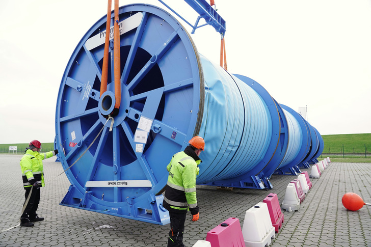 Insgesamt 14 Kabeltrommeln wurden Ende Februar von dem Frachtschiff „MS Concordia“ am Südkai des Hafens Emden angeliefert, wo sie zunächst von einem Hafenkran abgeladen und an Land gebracht wurden. Anschließend wurden die rund 50 Tonnen schweren Trommeln auf der 10.000 Quadratmeter großen Zwischenlagerfläche auf dem Südkai platziert. Dort werden sie gelagert, bis sie unmittelbar vor der Installation – einzeln auf Schwerlasttransporten – zu den Abspulplätzen transportiert werden, von denen aus die Installation erfolgt. Im Oktober 2023 hatte Prysmian im Kabelwerk in Gron mit der Produktion der besonders leistungsfähigen Kabel begonnen. Die Auslieferung erfolgt in einem mehrschrittigen Verfahren seit Ende 2023 auf dem Seeweg.