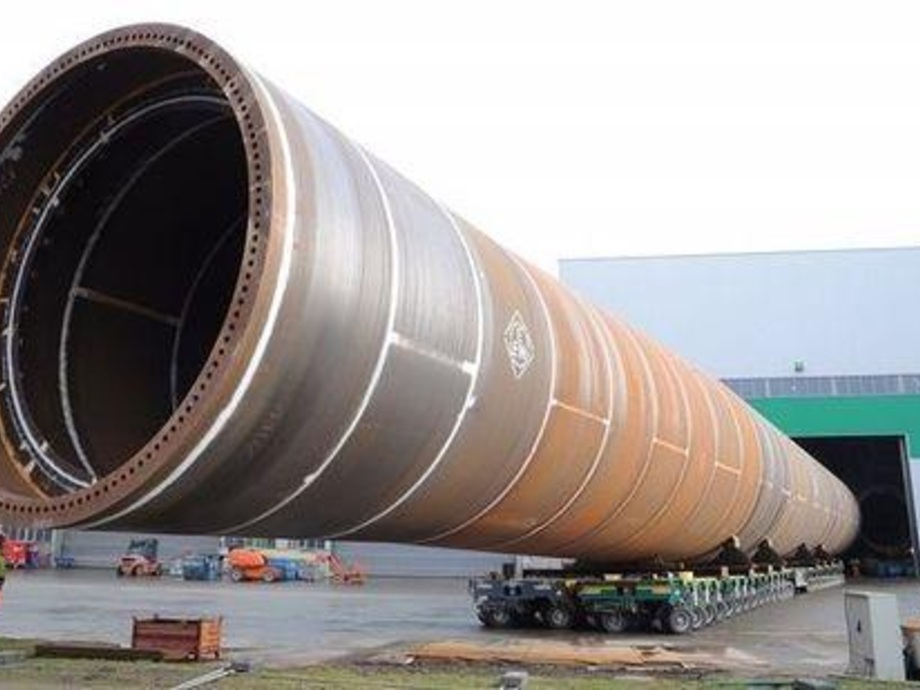 Rund 220 Doppelreifen waren im Einsatz, um das Monopile für den Nordsee-Windpark Veja Mate aus der Halle zu rollen. So umfangreiches Räderwerk setzte das Unternehmen EEW SPC ein, um am 2. März mit einem fahrbaren Ponton das fertig geformte gigantische Stahlrohr für den Standort in 40 Meter Wassertiefe aus der Halle zu fahren. Den vorigen Rekord der Branche hatte EEC SPC mit der Fertigung der Monopiles für den Offshore-Windpark Gode Wind 1-2 aufgestellt. Die 97 schon im September vergangenen Jahres jeweils 33 Meter in den Boden getriebenen Monopiles aus der Fertigung der Rostocker hatten einen Durchmesser von noch 7,5 Metern, eine Länge von 66 Metern und ein Gewicht von rund 940 Tonnen.