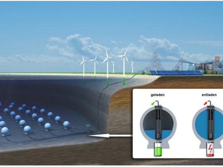 Wie funktioniert die Technik? Ziel ist es, Energie in der Nähe von Offshore-Windparks zu speichern. Das Prinzip des Hohlkugelspeichers gleicht dem von herkömmlichen Pumpspeicherkraftwerken – nur dass man statt zweier Speicherbecken einer Hohlkugel am Meeresboden hat. Einströmendes Wasser treibt eine Turbine an, die Strom erzeugt. Bei einem Überschuss an elektrischer Leistung wird das Wasser aus der Hohlkugel gepumpt. Das Pumpspeicherkraftwerk nutzt also als oberes Speicherreservoir das Meer selbst. Das untere Speicherbecken wird durch den Hohlkörper auf dem Meeresgrund gebildet.