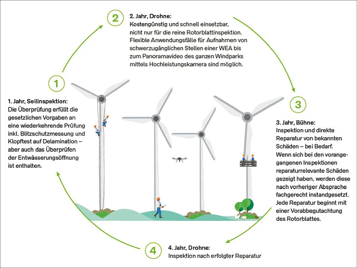 Da der Ertrag oder die Verfügbarkeit der Windenergieanlage im Mittelpunkt stehen, und da es zugleich wichtig ist, immer den aktuellen Status der Blätter durch jährliche Kontrolle vor Ort zu kennen, ist ein intelligenter Mix der genannten Technologien und Zugangsmethoden erforderlich. Die flexible Anpassung der Inspektionsmethode je nach letztem Inspektionsergebnis ist dabei der entscheidende Faktor. Dies lässt sich am Schaubild rechts gut darstellen: Hier werden die unterschiedlichen Inspektionstechniken im Jahresrhythmus der Reihe nach eingesetzt, beginnend mit der Inspektion aus dem Seil mitsamt Blitzschutzmessung und Prüfung auf Delaminationen, gefolgt von der Sichtprüfung mittels Drohne. Wird dabei Reparaturbedarf festgestellt, erfolgt je nach Dringlichkeit die Reparatur sofort oder geplant im dritten Jahr. Denkbar ist auch, dass keine Instandsetzung im dritten Jahr erforderlich ist – basierend auf den Ergebnissen der Drohneninspektion aus Jahr zwei. Dann kann erneut die effiziente Drohneninspektion folgen. Spätestens im vierten Jahr muss ein Techniker-Team aus dem Seil oder der Bühne wieder an die Blätter, um die Anforderungen der zustandsorientierten oder der wiederkehrenden Prüfung zu erfüllen. Damit endet der erste Zyklus, und ein neuer Durchlauf mit gleicher oder angepasster Reihenfolge startet.