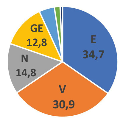 Wie sich die Wind-energieanlagenhersteller 2021 den deutschen Onshore-Markt aufteilten. Ranking in Prozent: 1. Enercon (E), 2. Vestas (V), 3. Nordex (N), 4. GE, 5. Siemens Gamesa mit 4,5, 6. Vensys mit 1,7, 7. Eno mit 0,7 Prozent.